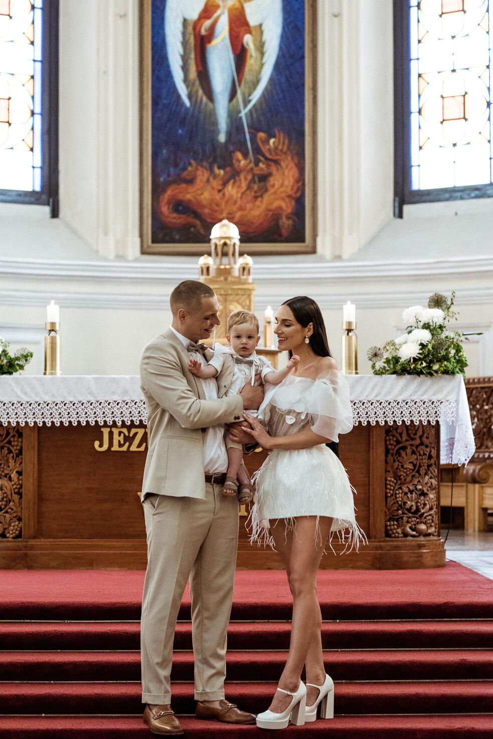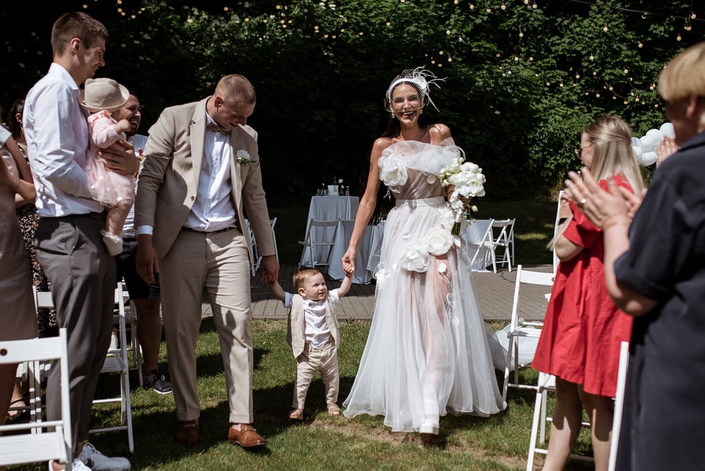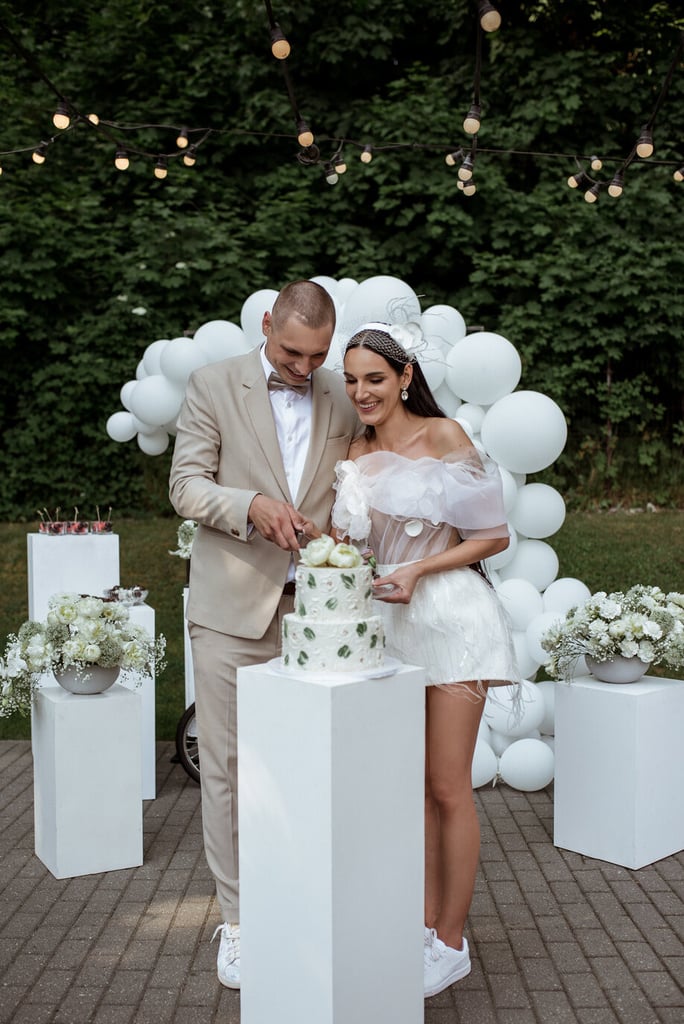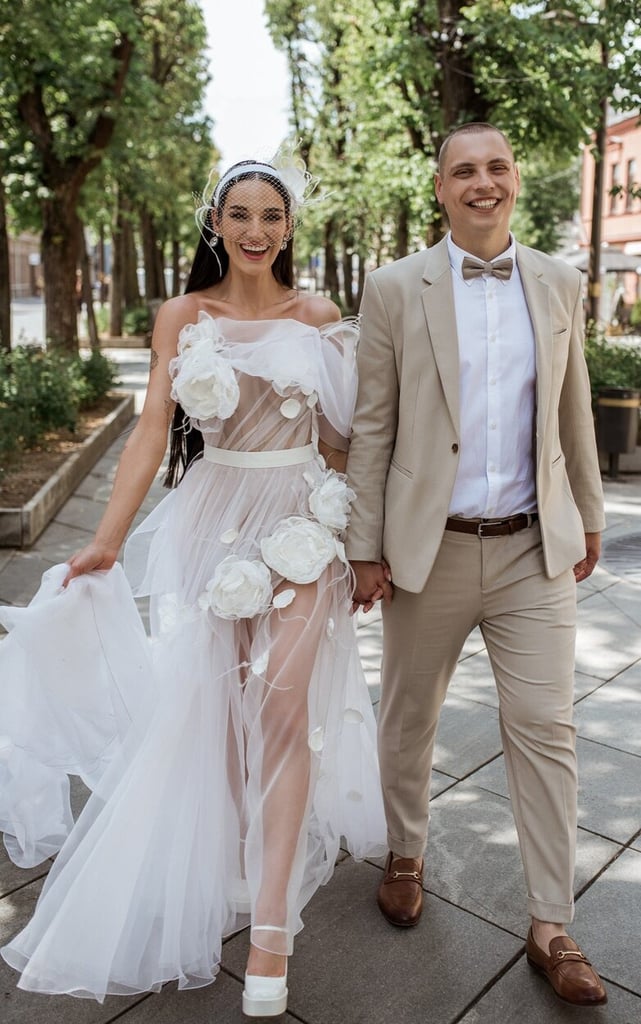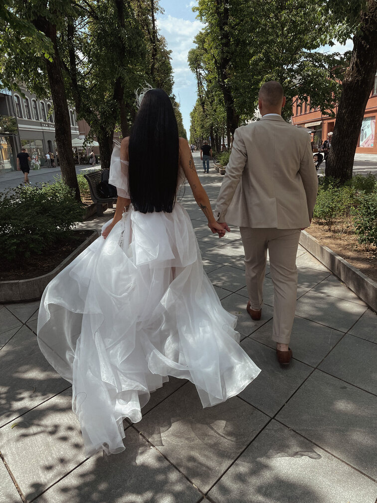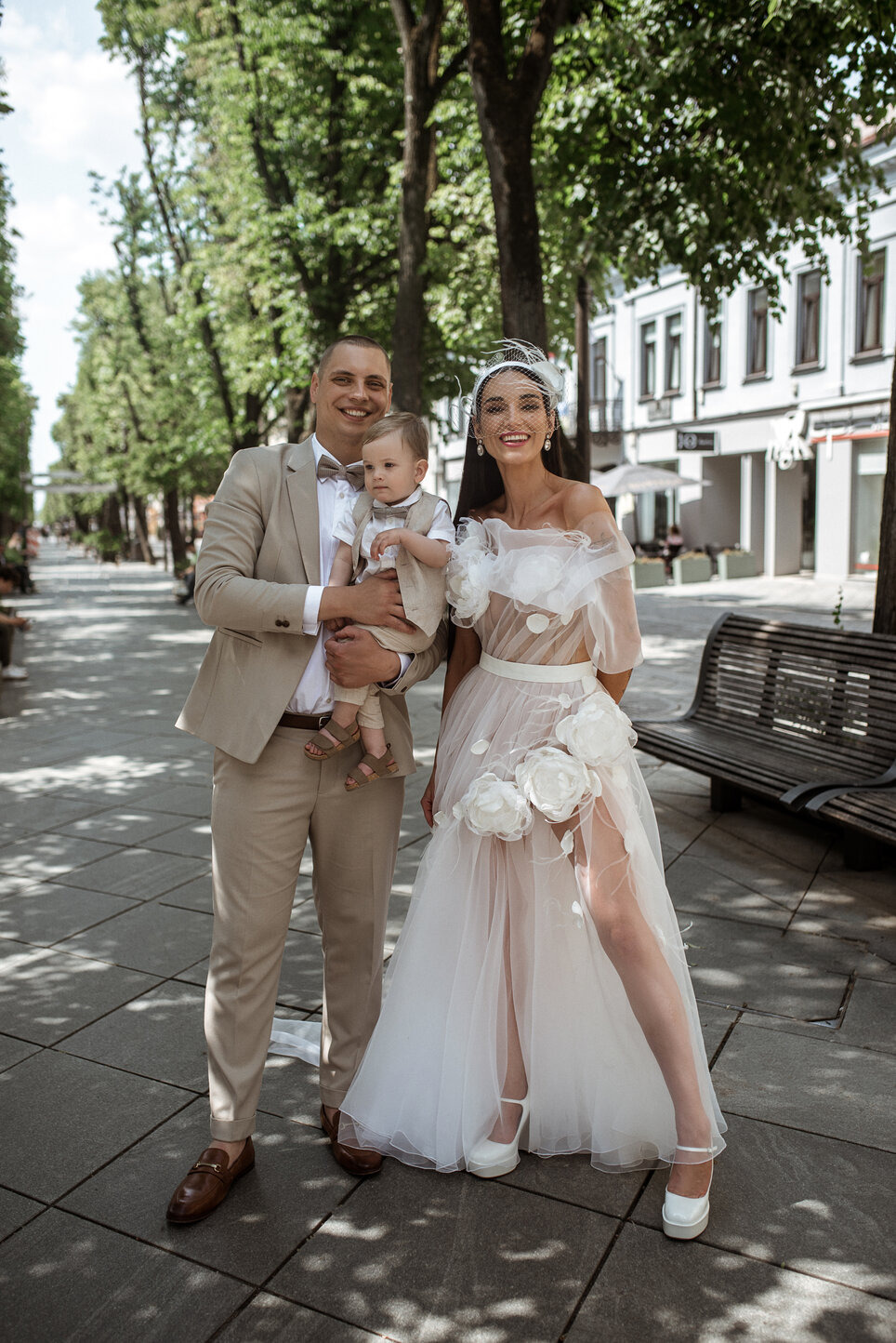 „Pradžioje planavome ir svečius sukvietėme tik į sūnaus krikštynas, o vestuvės tapo staigmena atvykusiems į šventę. Pakeitus krikšto ceremonijos metu vilkėtos suknelės trumpą sijoną ilgu, suknelė transformavosi į vestuvinę, – pasakojo nuotaka Aistė. – Savo įvaizdį visiškai patikėjau dizaineriui, stilistui Liutaurui Salasevičiui, nes esame draugai jau daugiau nei 10 metų, tad jis mane gerai pažįsta ir puikiai žino, kas tinka mano asmenybei. Laiko sukurti suknelei turėjome vos tris savaites.“