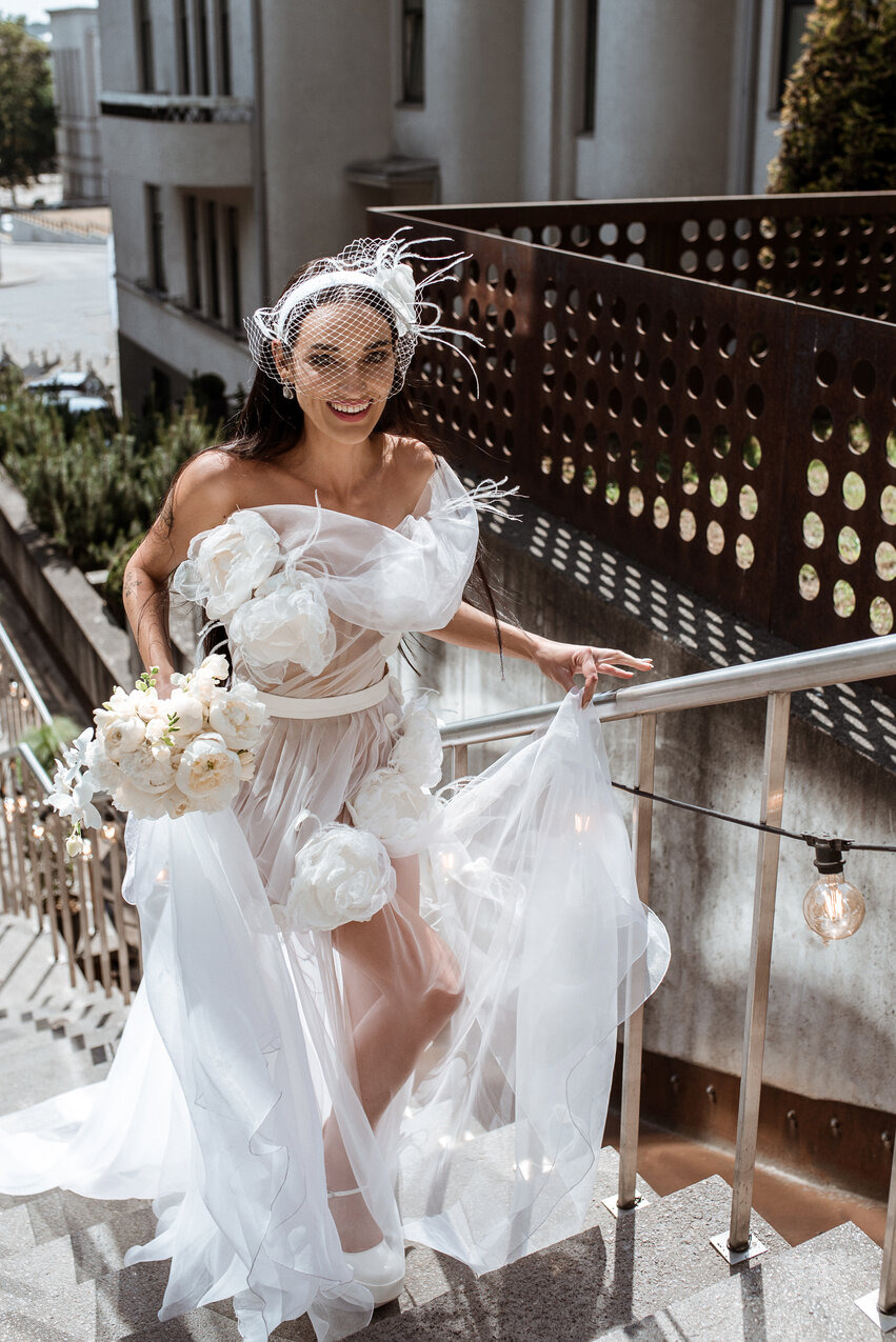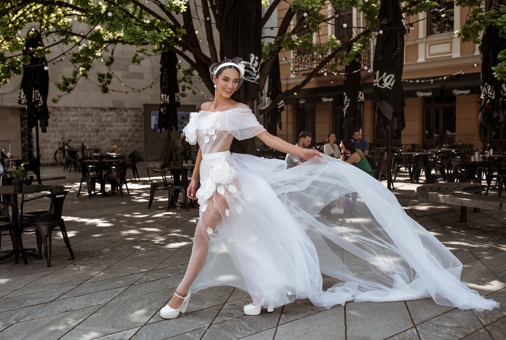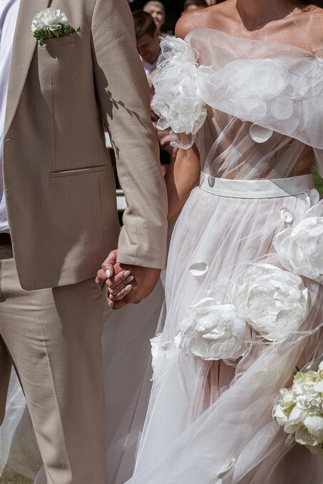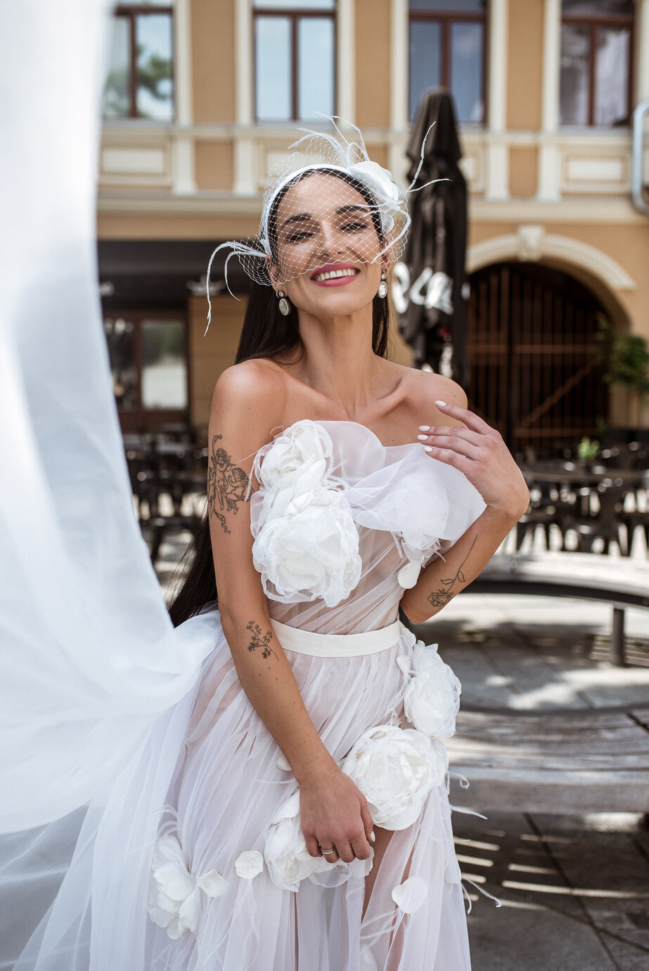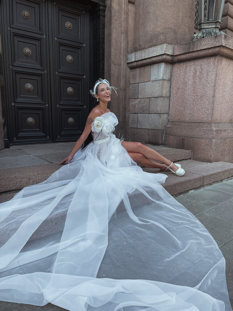 Idėją suknelei padiktavo šventės laikas – tik beprasidedanti vasara ir bijūnų žydėjimas. Norėjosi lengvumo, gėlių žiedų ir vėjyje plazdančių detalių.