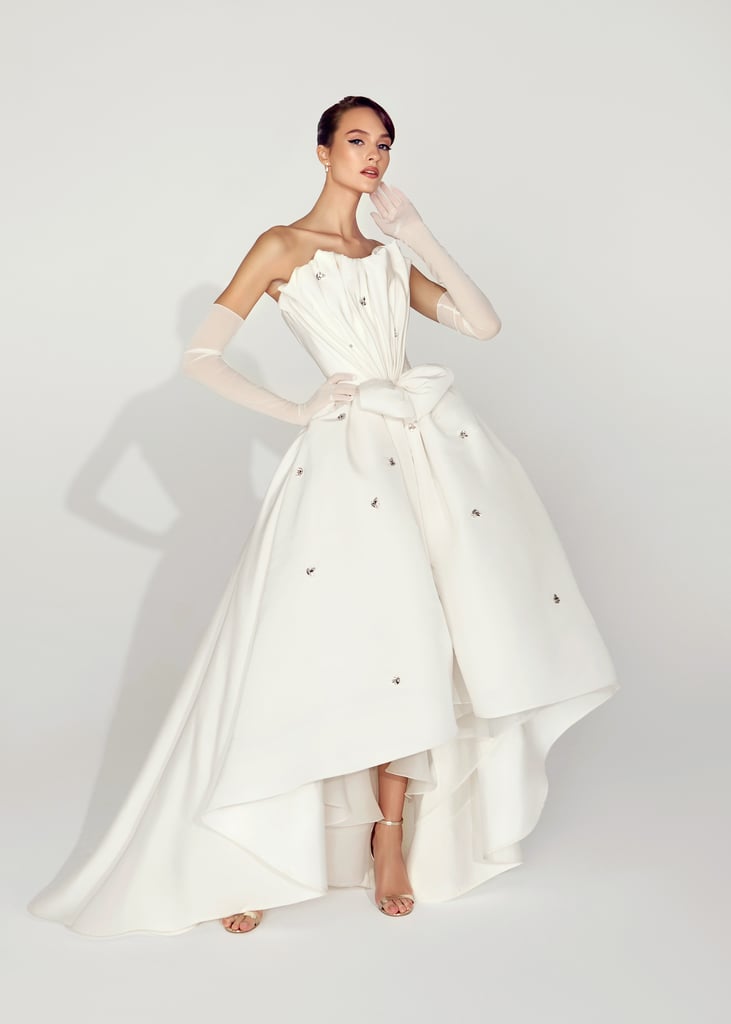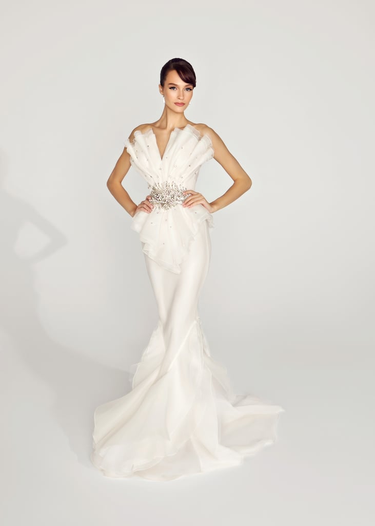 Todėl daug investuojame į siluetų išdirbimą, kirpimus, ypač audinius. Kaip ir kasmet dirbame tik su aukščiausios kokybės šilkais: audiniai brangūs ir prabangūs, juos naudoja žymiausi mados namai visame pasaulyje. Visi jie išaudžiami specialiai mums gražiausioje Italijos vietoje, prie pat Komo ežero. Ten, beje, tuokiasi ir mus pasirinkusios nuotakos”, – šypsosi kūrėjas.