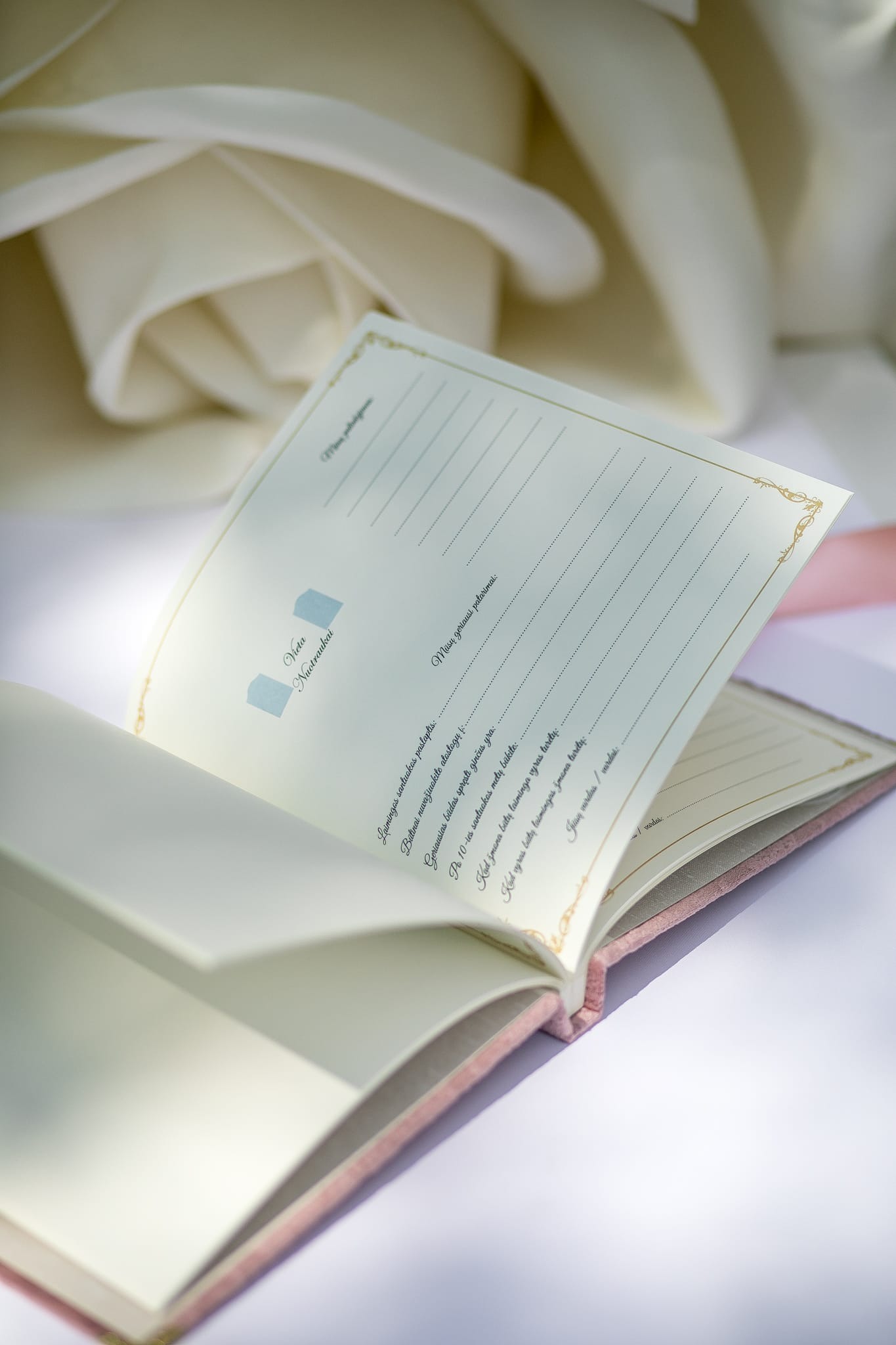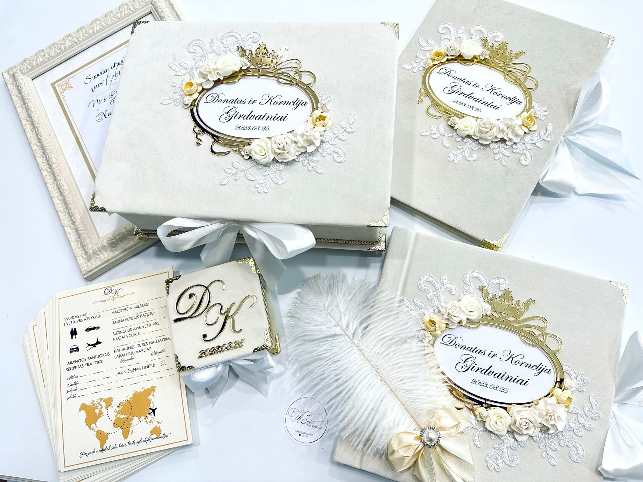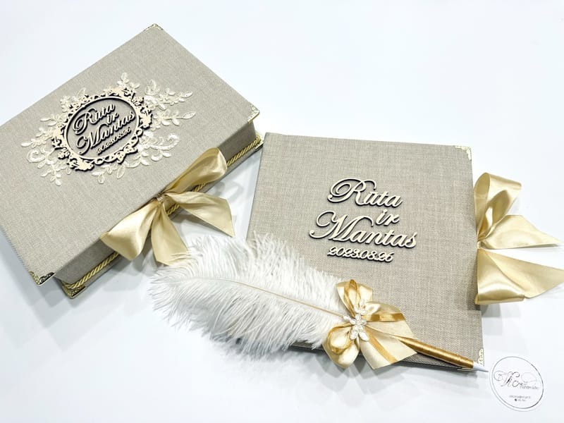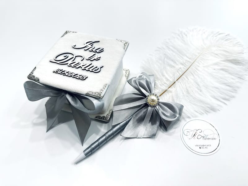Jums galime pasiūlyti įvairaus dekoro palinkėjimų knygas ar palinkėjimų dėžutes. Knygas gaminame su įvairia spauda ar be jos. Prie palinkėjimų knygos galime sukurti dekoruotą rašiklį bei instrukciją. Taip pat gaminame žiedų dėžutes ir dežutes vokams.