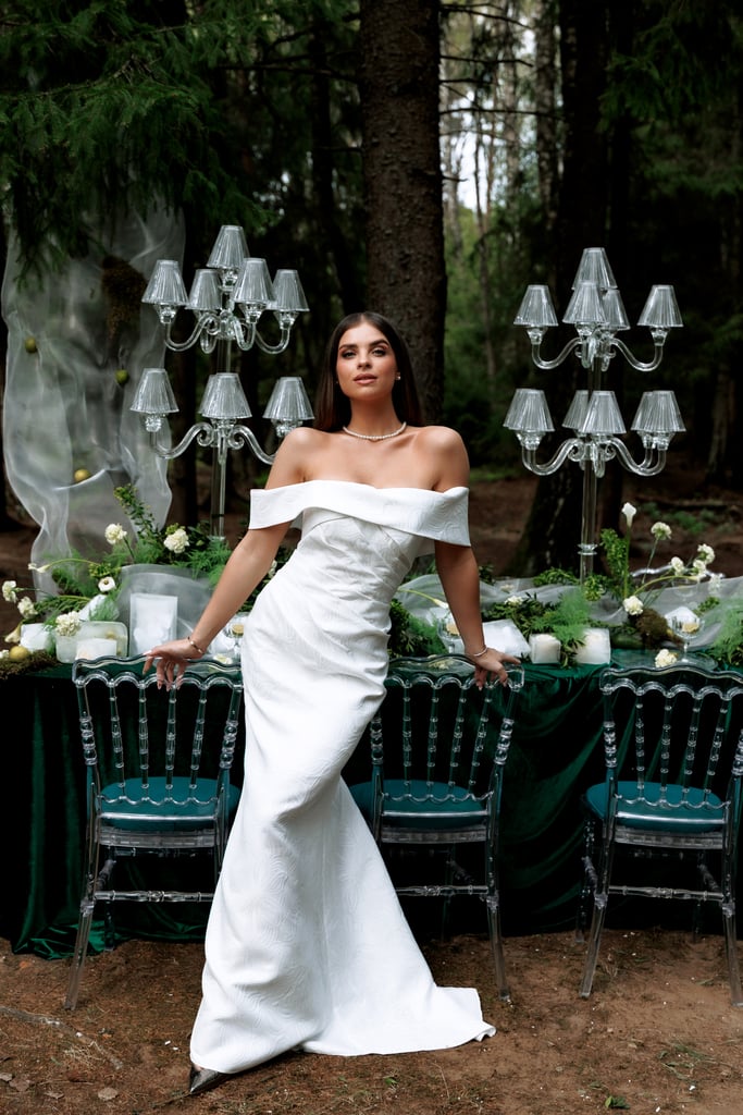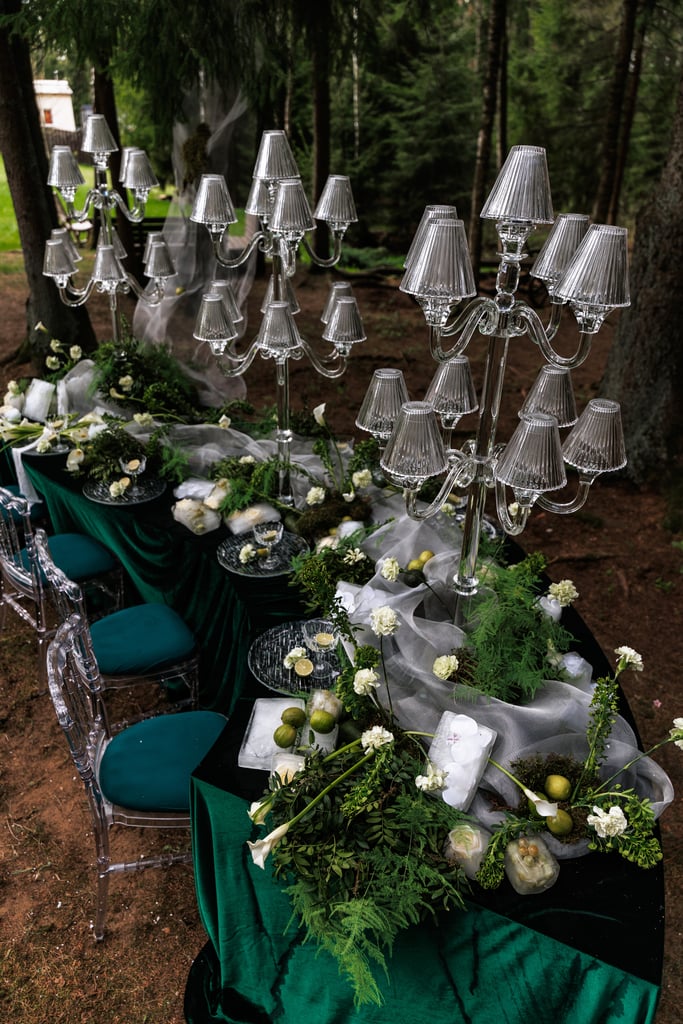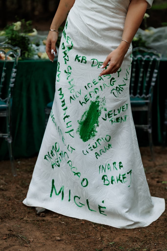 Dekore taip pat panaudoti šiuo metu ypač populiarūs vingiuoti stalai. Dekoratorė Kamilė iš „KB Decor“ meistriškai įgyvendino projekto dekoro koncepciją, papildydama ją originaliais sprendimais, todėl galutinis rezultatas – įspūdingas prabangus dekoras miške – pranoko visus lūkesčius. Net modelio suknelė, įsigyta išparduotuvėje, tapo meninės laisvės simboliu – po fotosesijos visa komanda ant jos pasirašė.