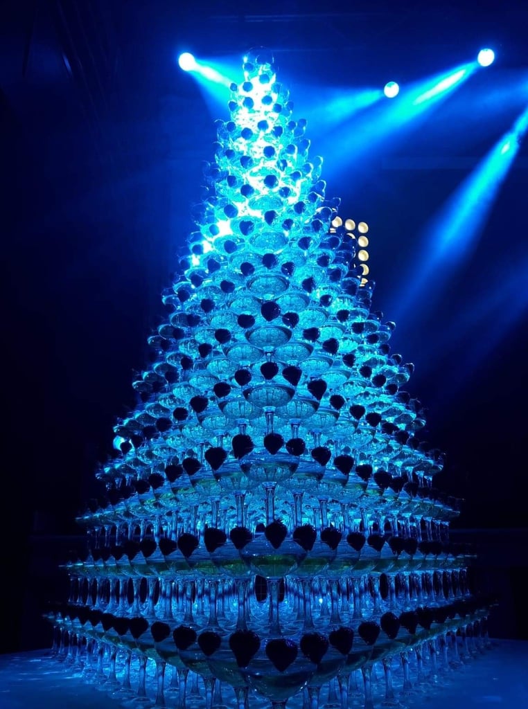 Šampano taurių piramidės ratas su aplink jaunuosius besisukančiais ugnies fontanais – 2025-ųjų m. naujiena. CWB barmenai – vieninteliai Lietuvoje, galintys pasiūlyti tokią paslaugą!